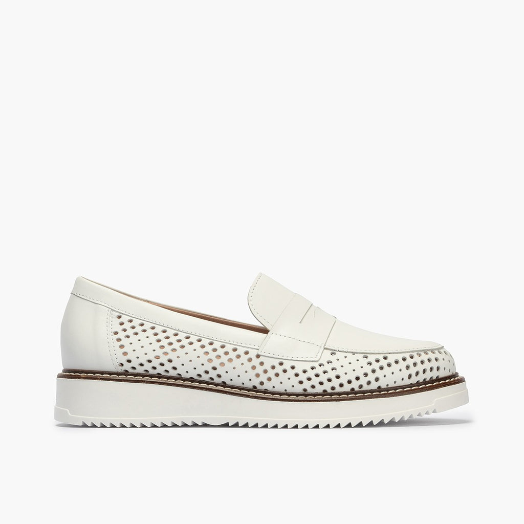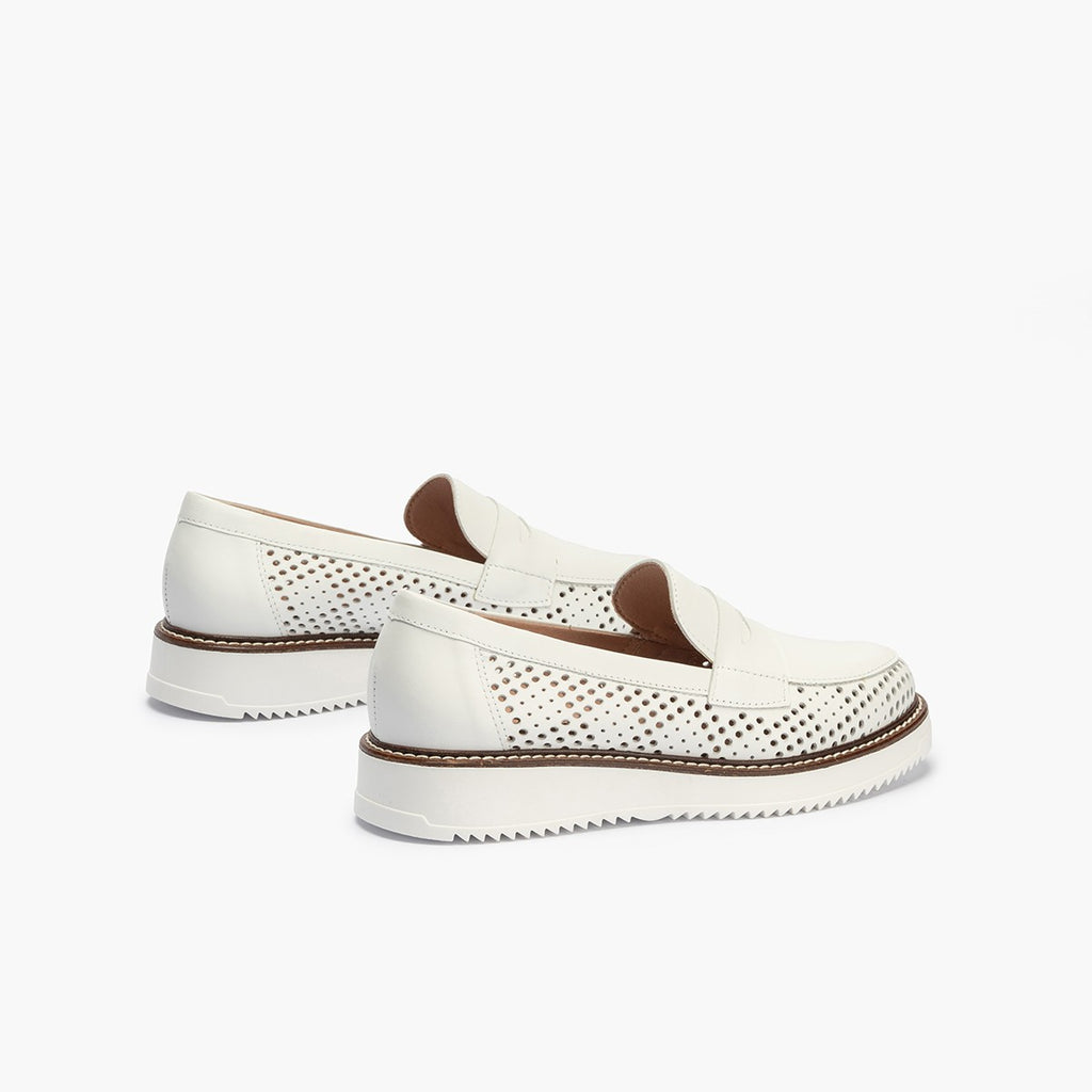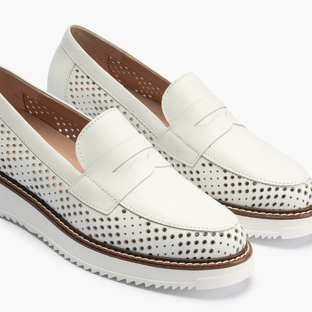 Mocasines de mujer con plataforma de piel con adorno antifaz de color BLANCO: Estos elegantes mocasines de plataforma en color blanco ofrecen un estilo clásico y sofisticado, perfectos para cualquier ocasión casual o semi-formal.