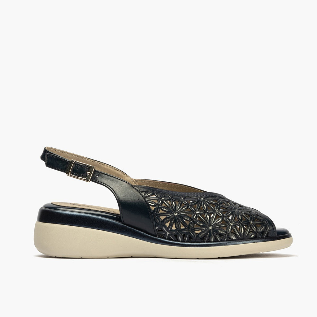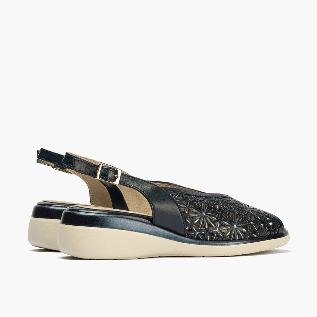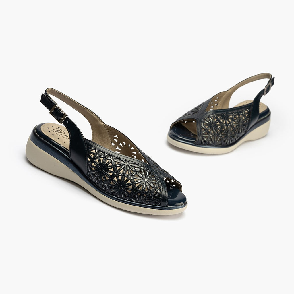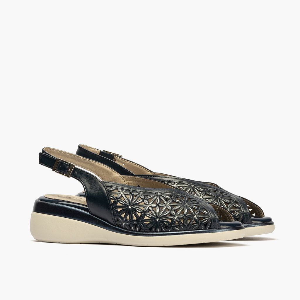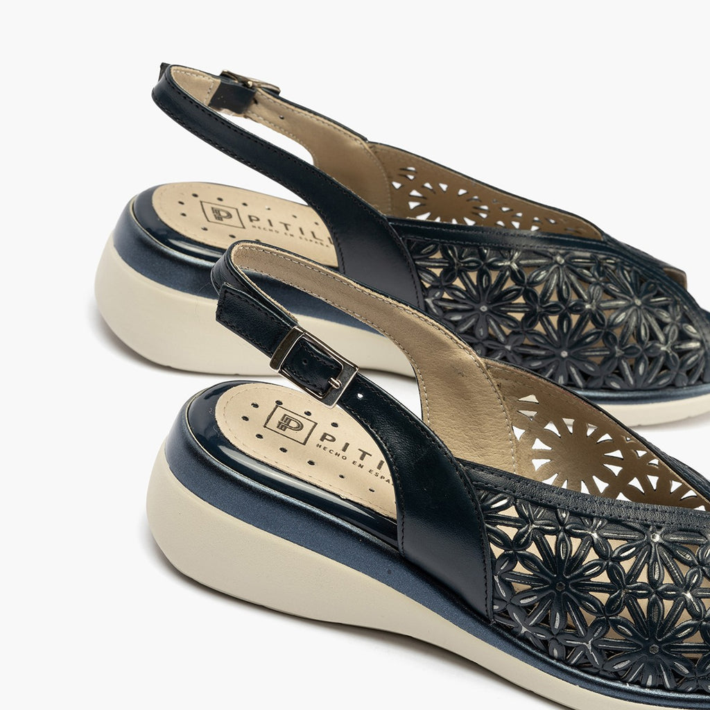 Sandalia cuña mujer piel grabado azul: Modernidad y versatilidad se fusionan en esta sandalia de cuña para mujer en piel grabada en tono azul, perfecta para complementar tus outfits con un toque contemporáneo.