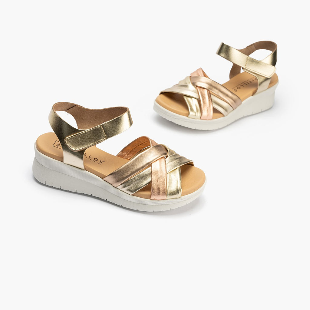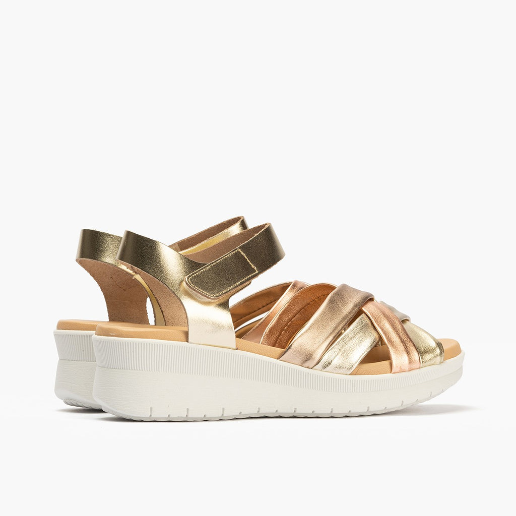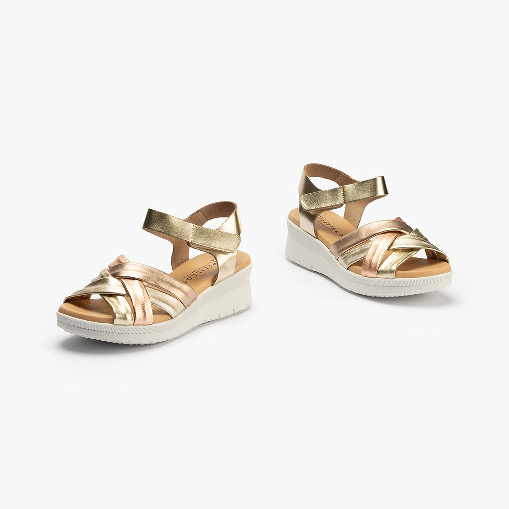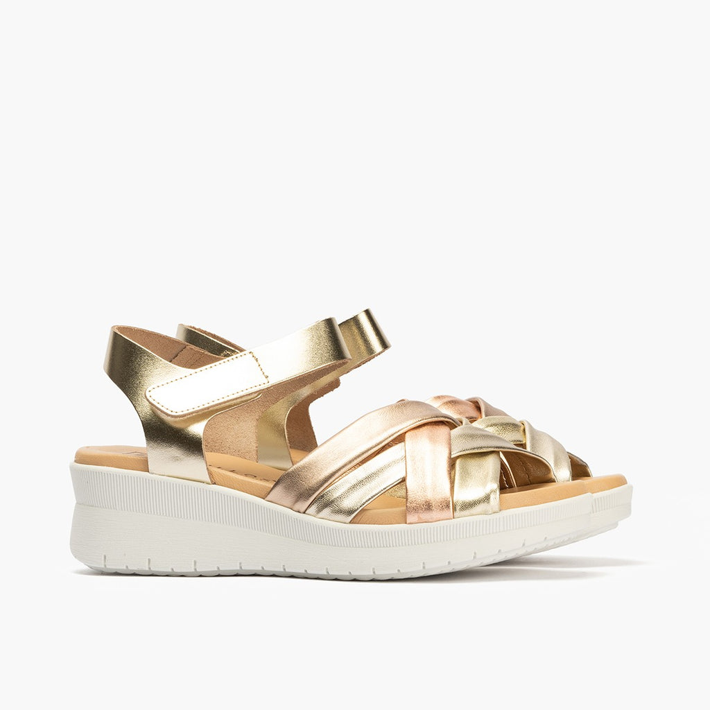 Sandalia de mujer con pala-talón tubulares en dorado: la sofisticación en su máxima expresión.