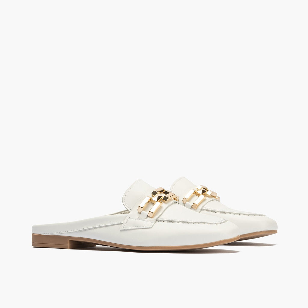 Mocasines de mujer zueco estilo mule con adorno y tacón bajo de color BLANCO: La versatilidad se une al estilo en estos mocasines estilo mule de color blanco; son fáciles de poner y listos para cualquier ocasión.