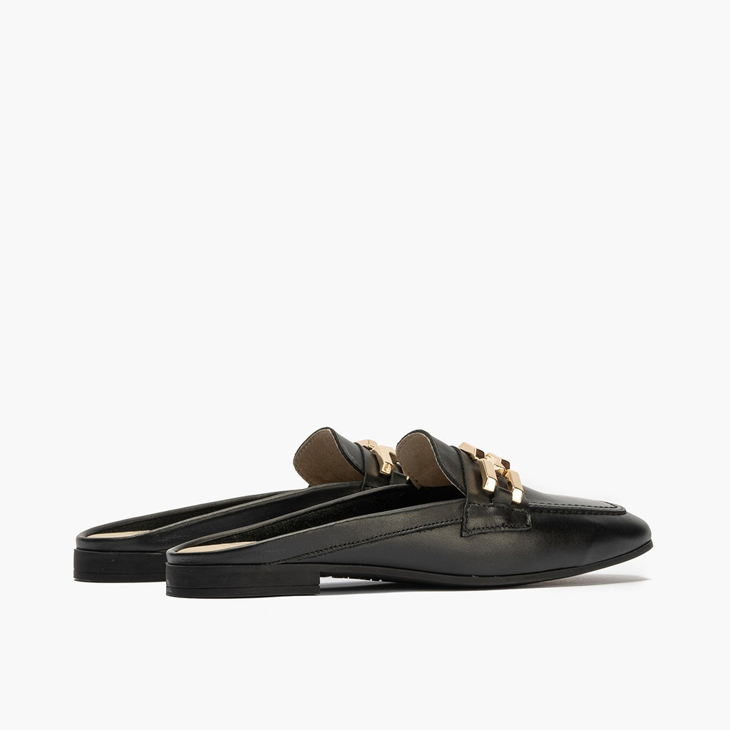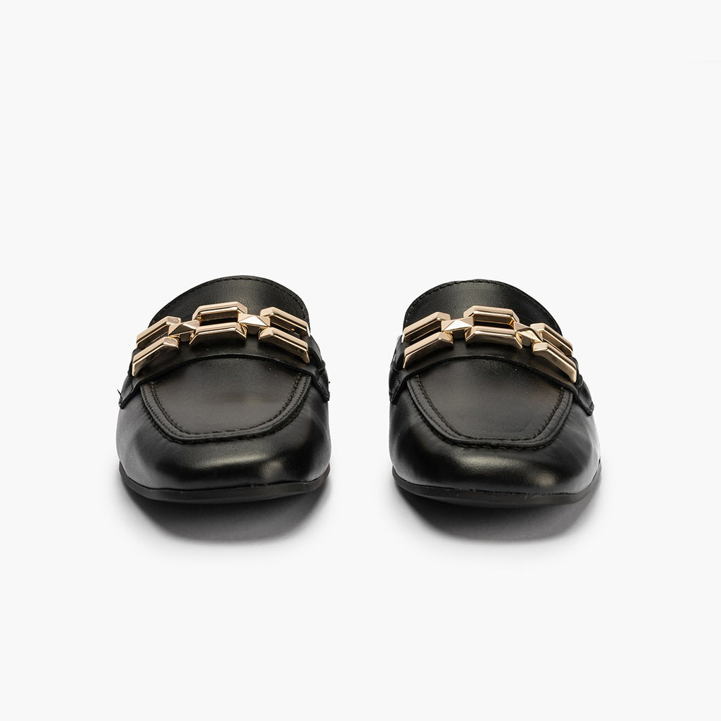 Mocasines de mujer zueco estilo mule con adorno y tacón bajo de color NEGRO: Un básico indispensable, estos mocasines mule de color negro son el epítome del estilo fácil de llevar, con la ventaja adicional de un tacón bajo cómodo.