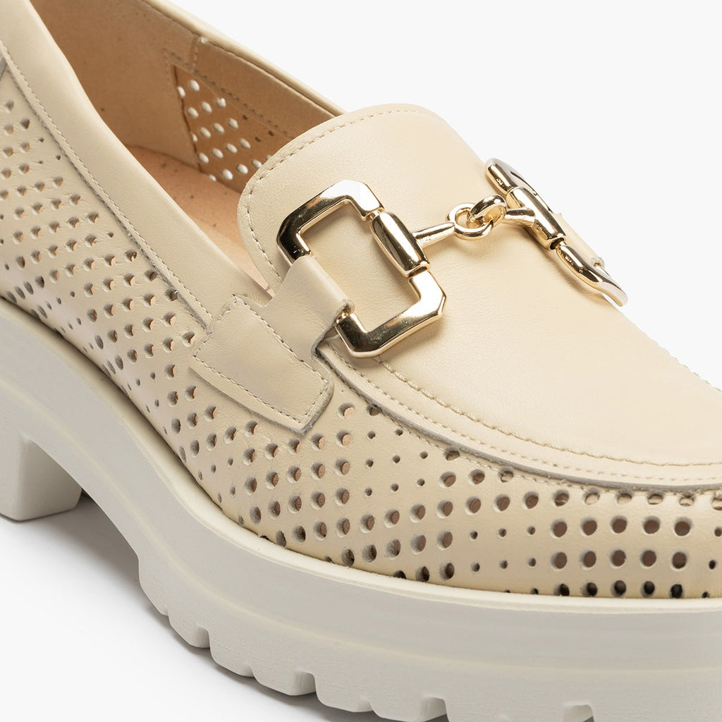 Mocasines de mujer en piel picada con adorno de estribo y tacón bloque CREMA