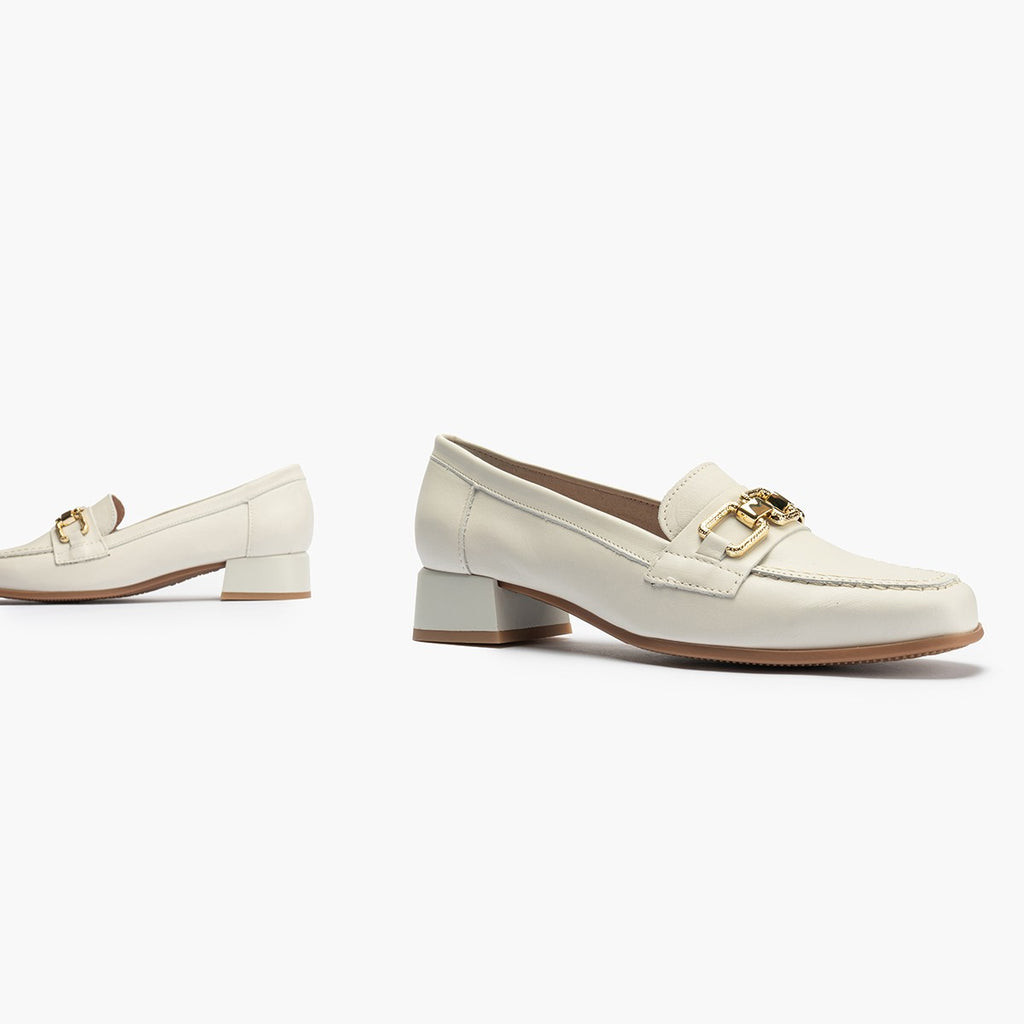 Mocasines de mujer en piel y adorno cadena metálica y tacón BLANCO