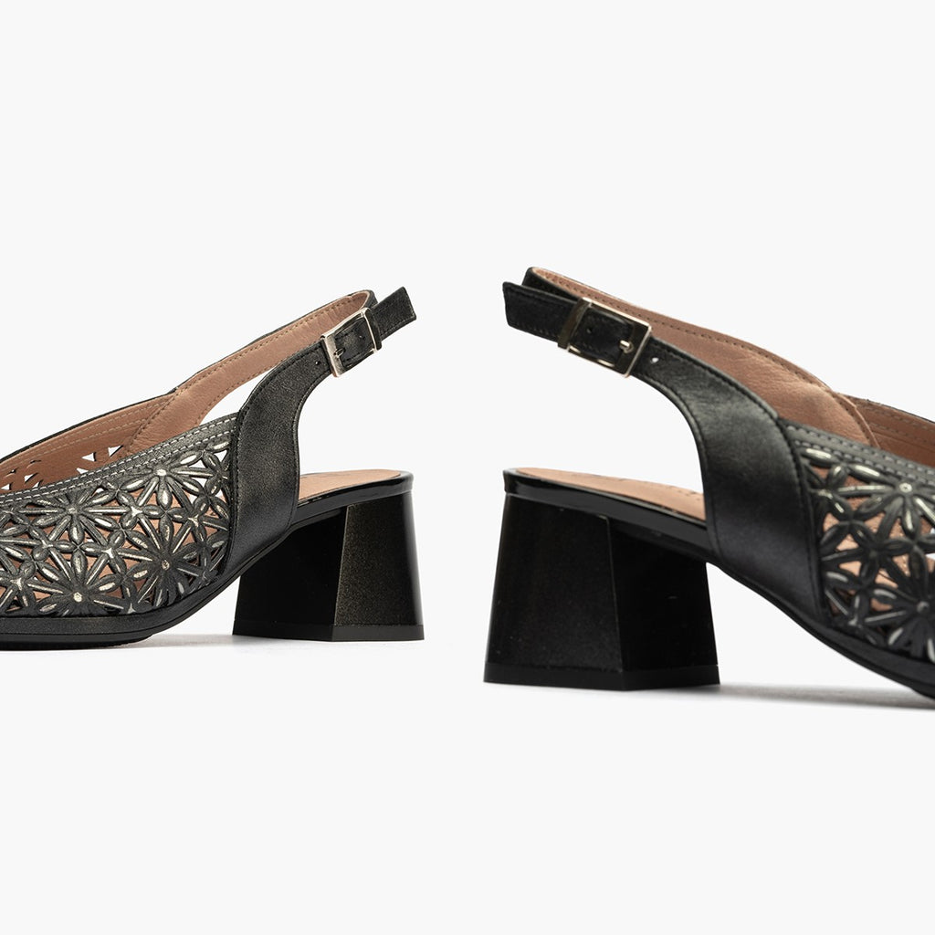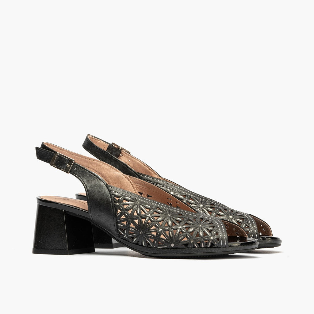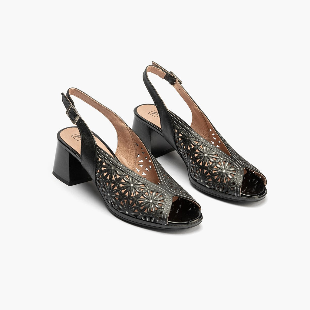 Sandalia tacón mujer picados negro: Elegancia atemporal y versatilidad en unas sandalias de tacón con detalles picados en negro, ideales para lucir con estilo en cualquier ocasión.
