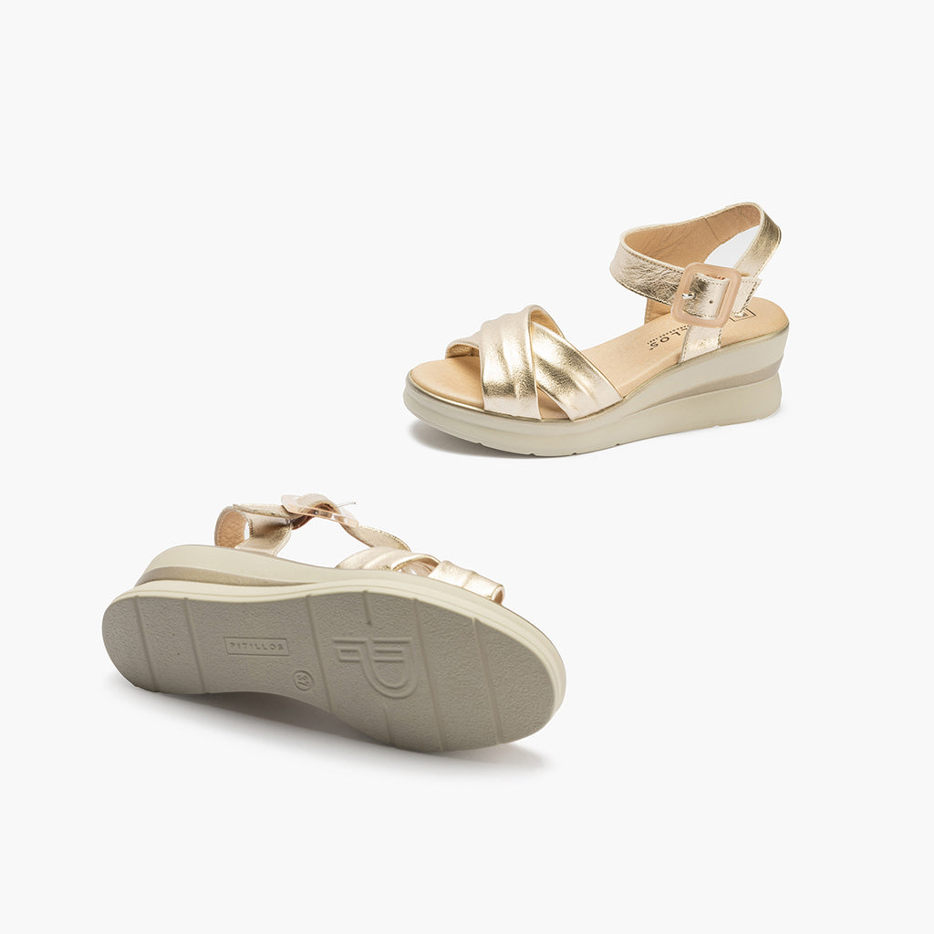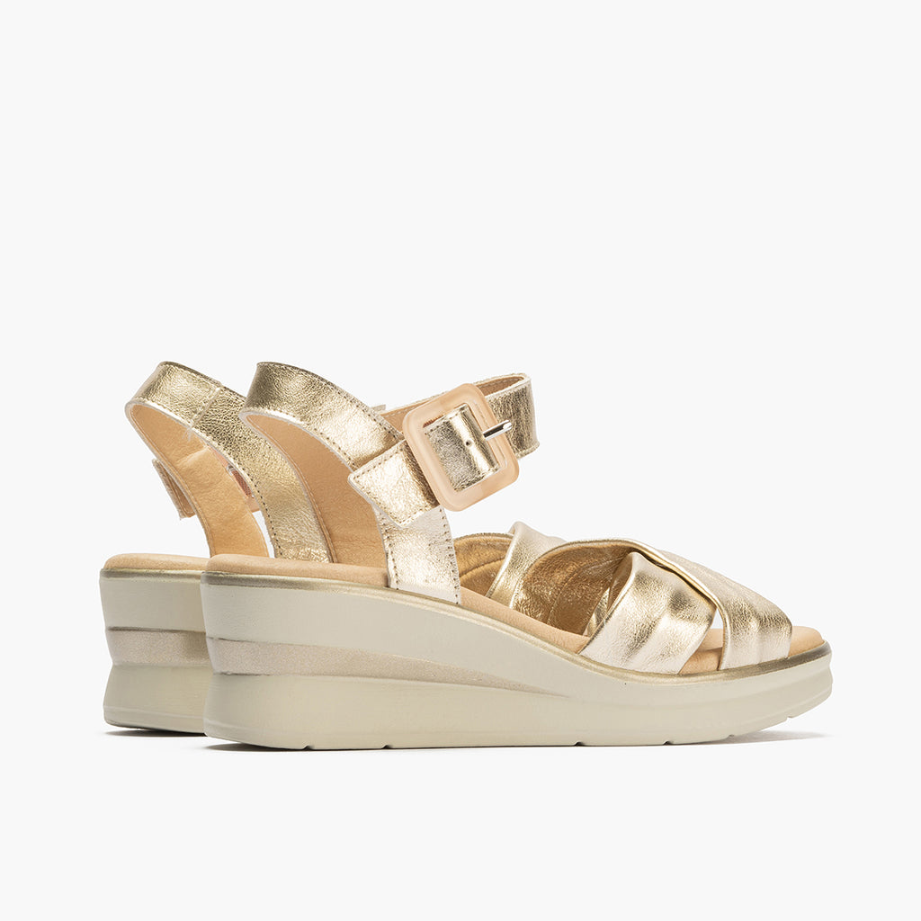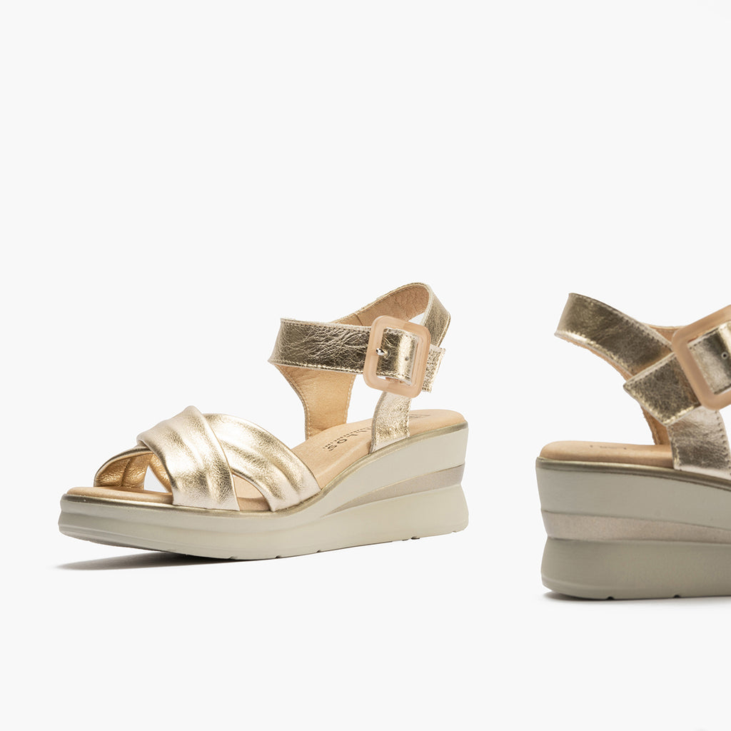 Sandalia mujer plataforma con hebilla en piel laminado ORO