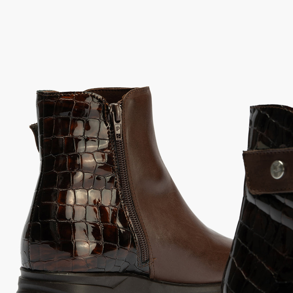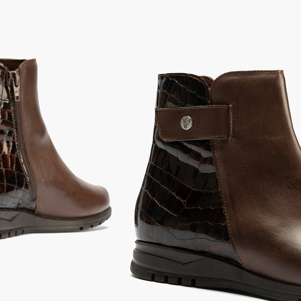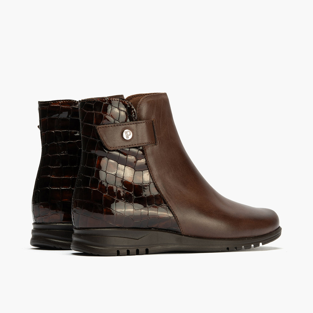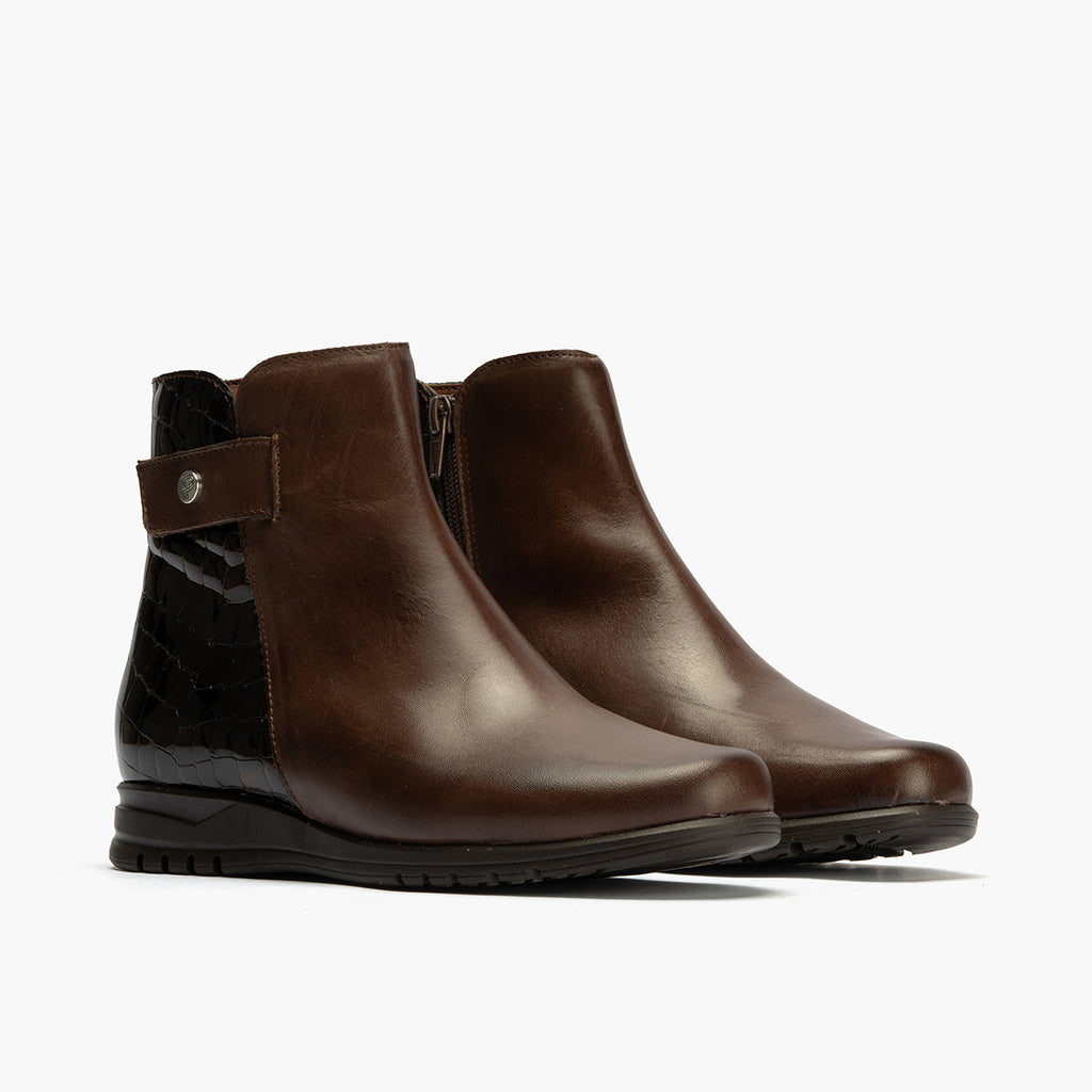 Botín Combinado en napa con coco charol de mujer color marron: Su combinación de texturas y acabados lo convierte en una pieza única para completar cualquier conjunto.