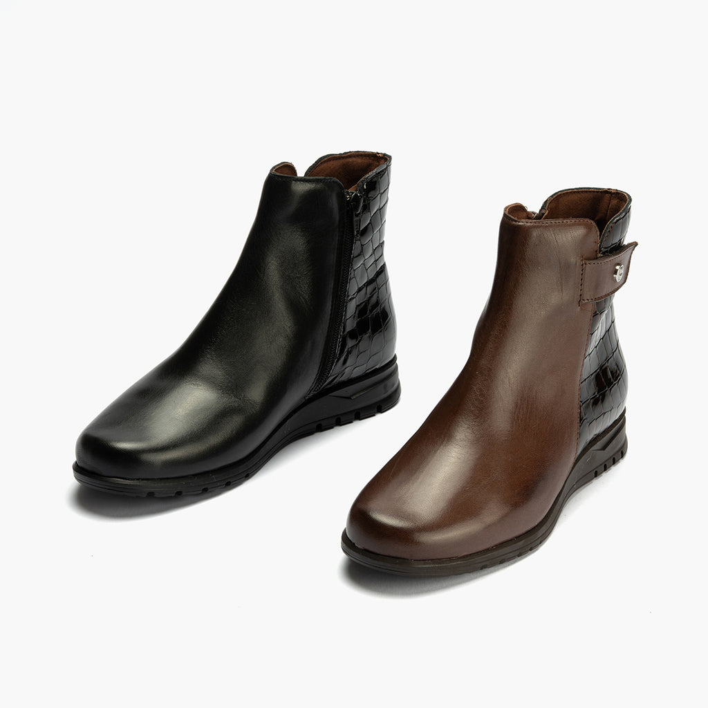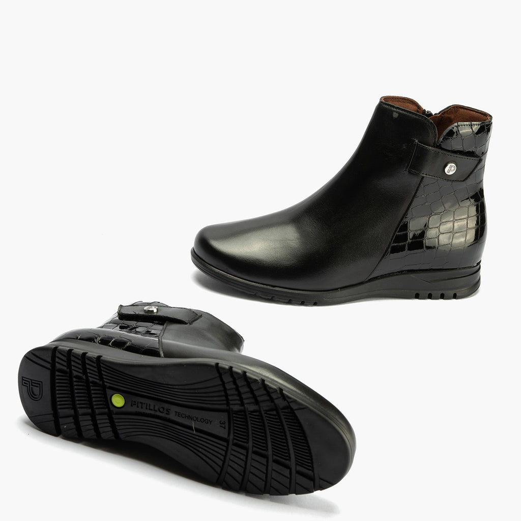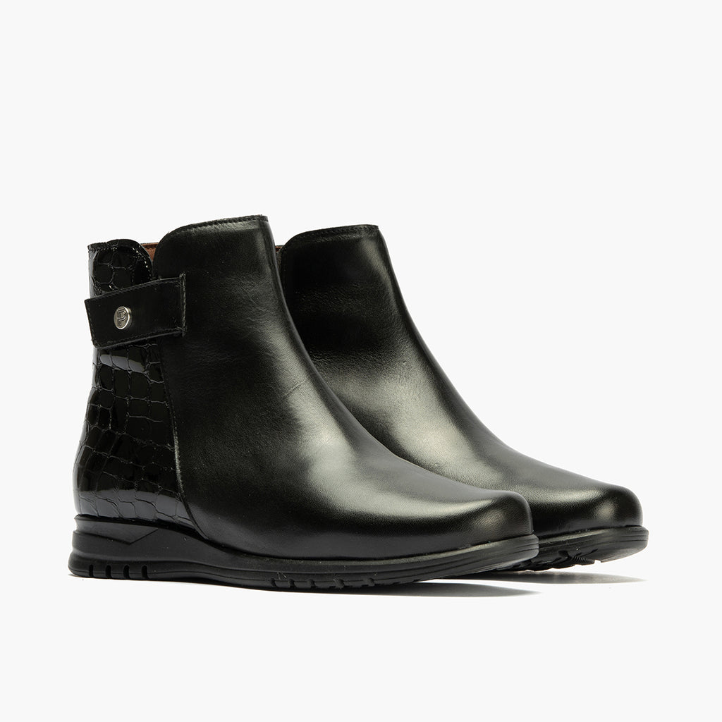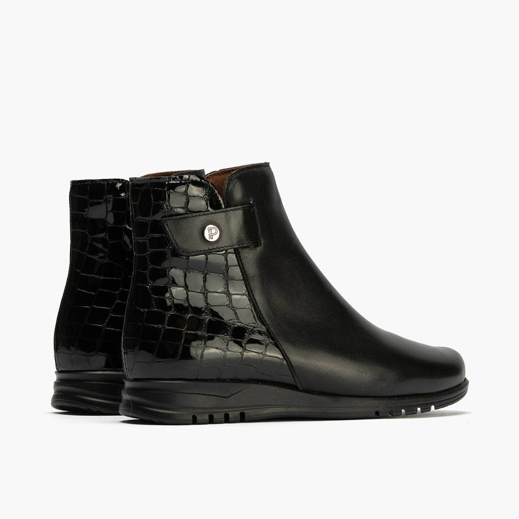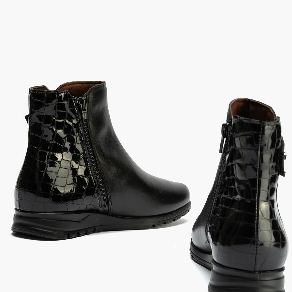Botín Combinado en napa con coco charol de mujer color negro: Su combinación de texturas y acabados lo convierte en una pieza única para completar cualquier conjunto.
