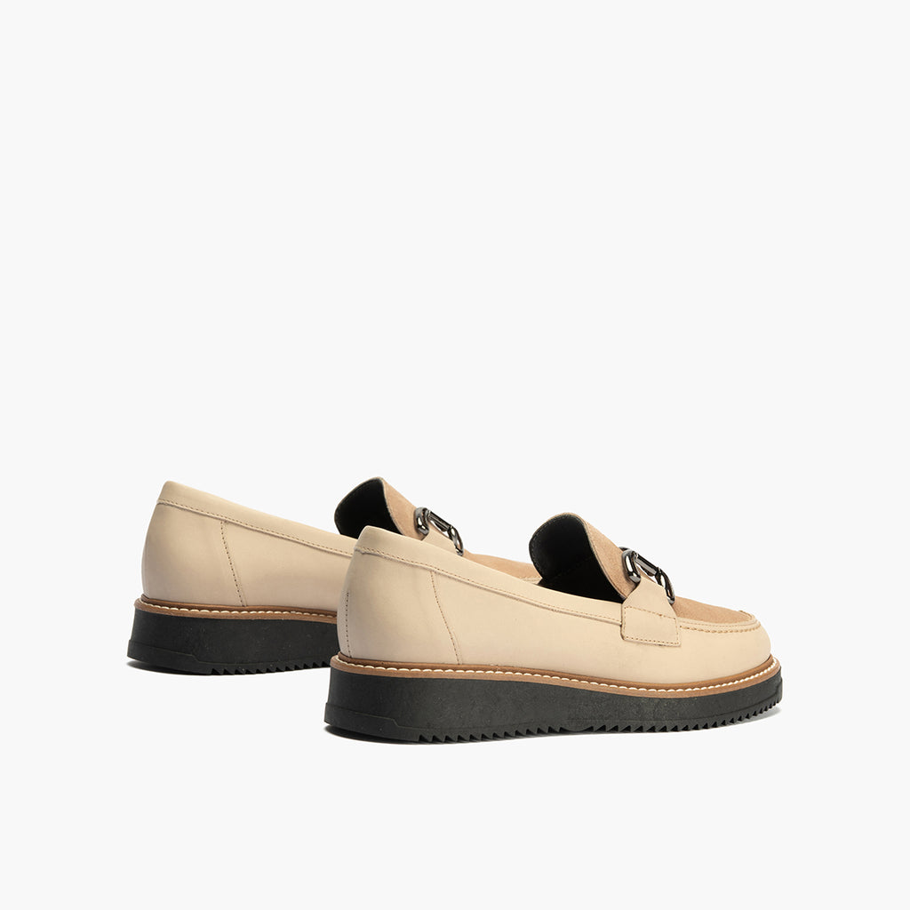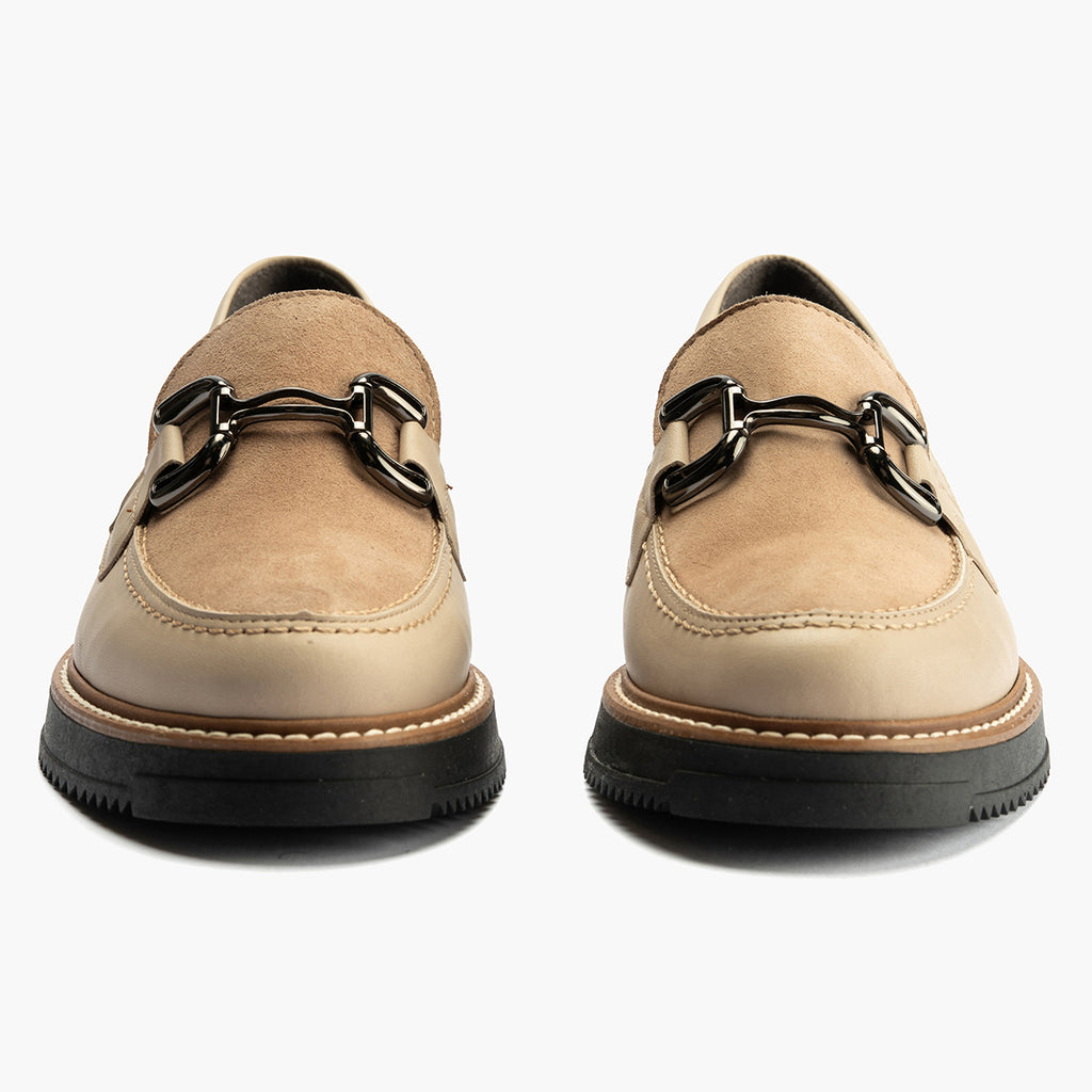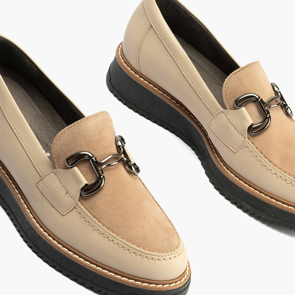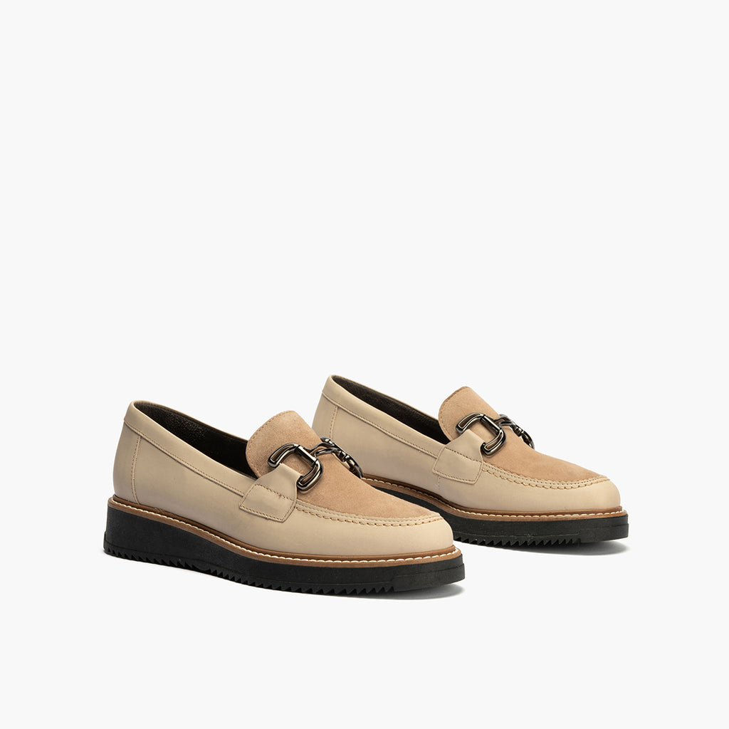 Mocasín Combinado Ante de mujer color piedra: Diseñados para caminar con estilo y sentir comodidad en cada paso.