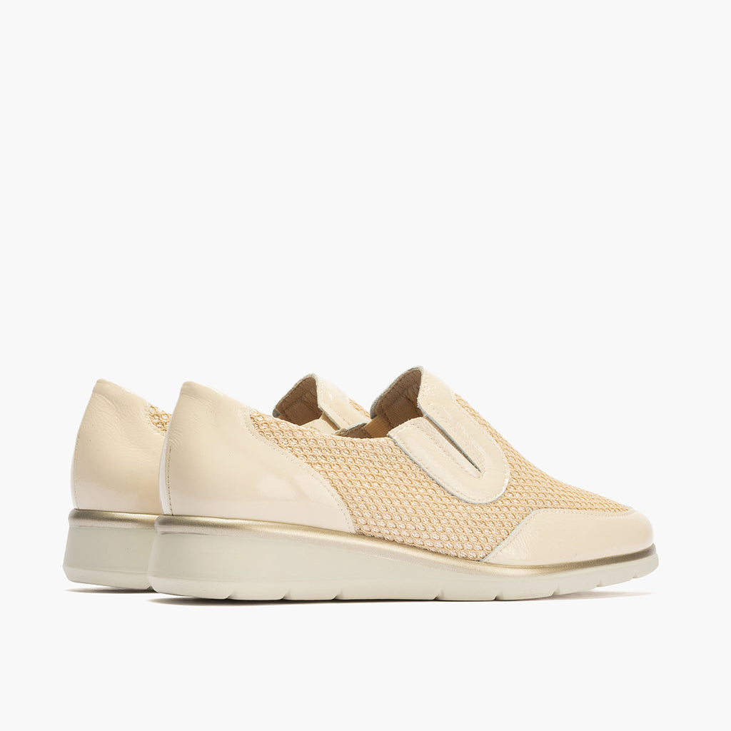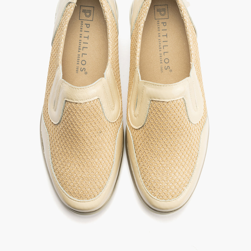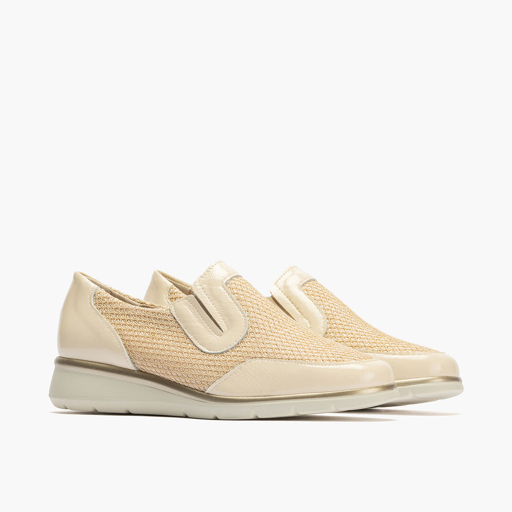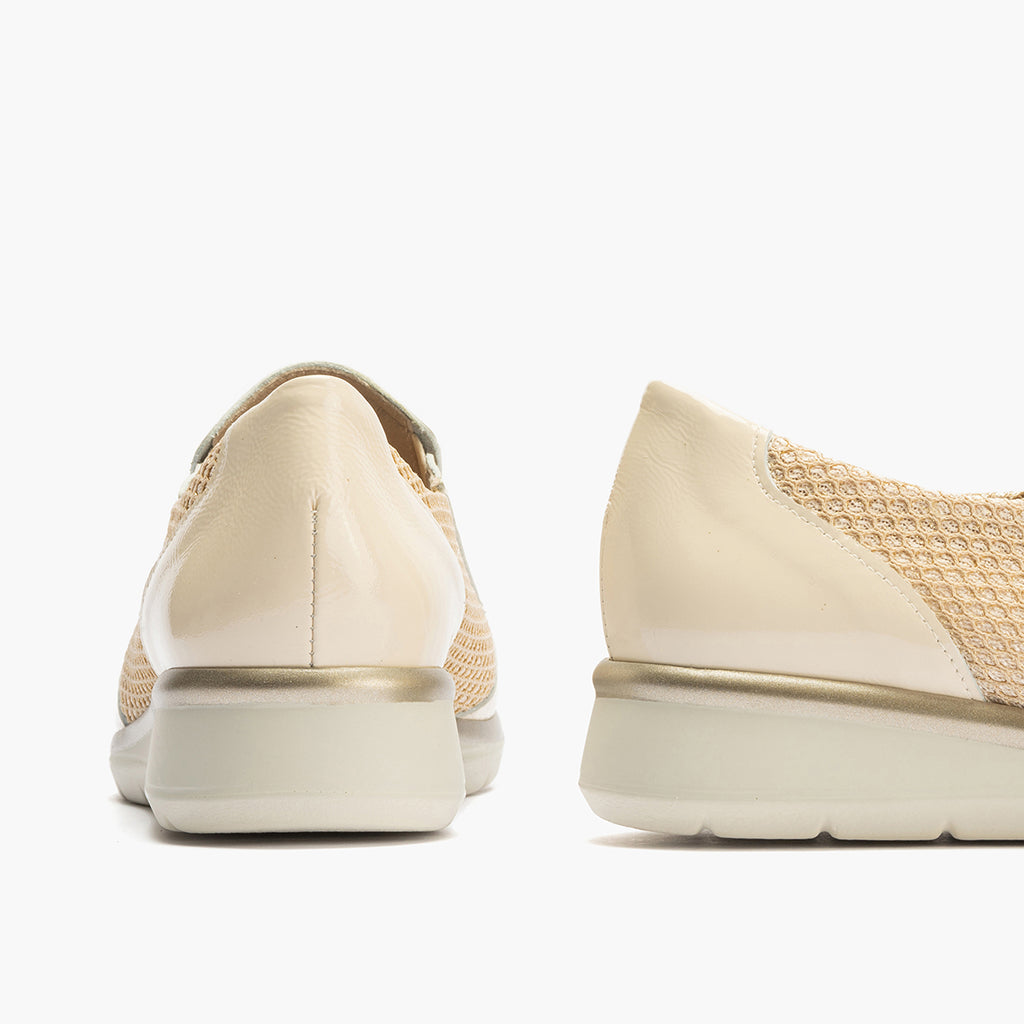 Manoletina mujer con elásticos en rejilla y piel charol CREMA