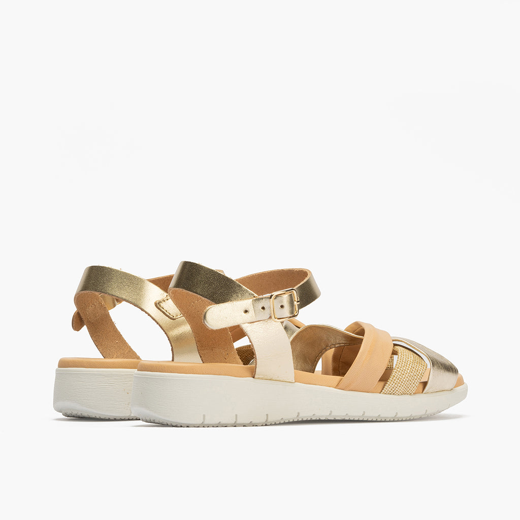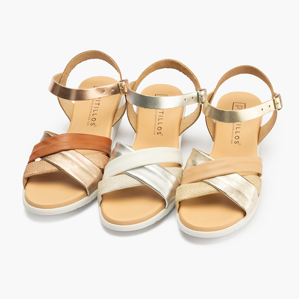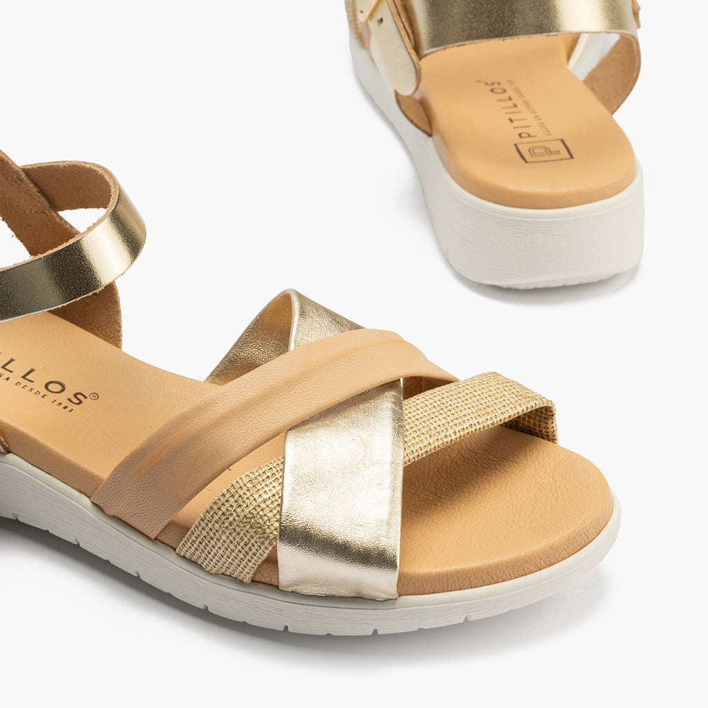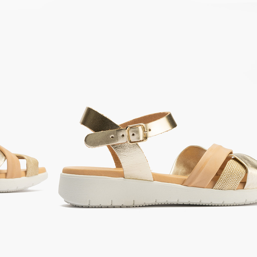 Sandalia pala tubulares cruzados mujer con hebillas en piel combinada ORO