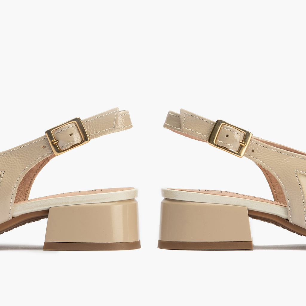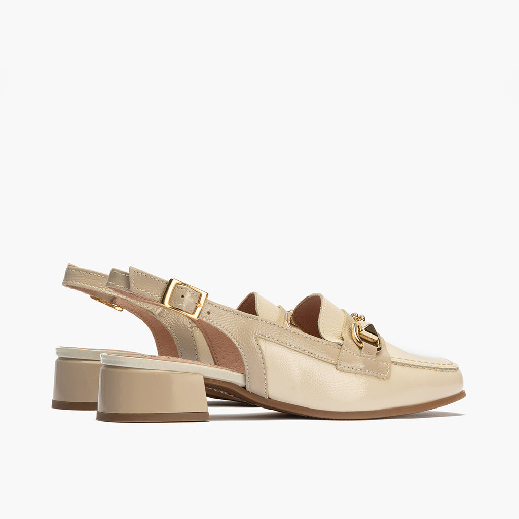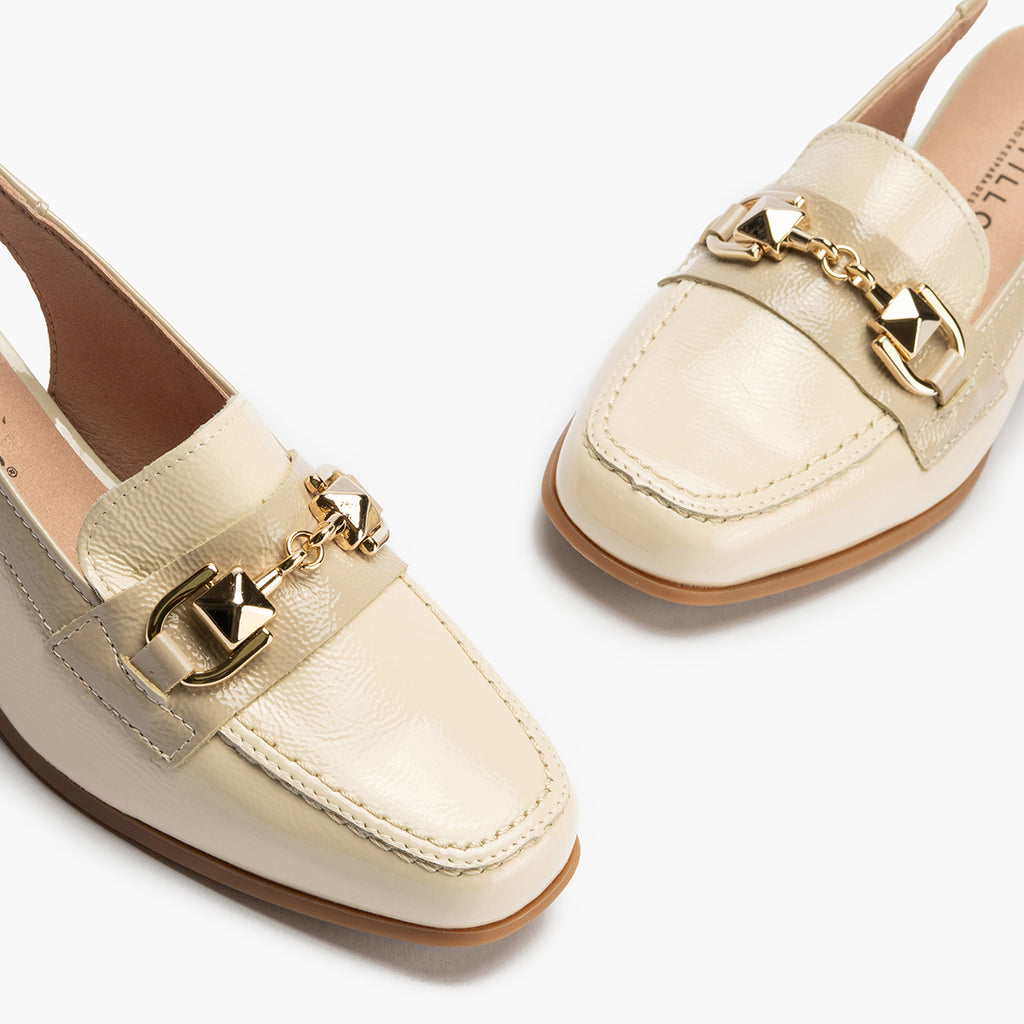 Mocasin punta cuadrada talon abierto mujer con hebilla en piel charol CREMA