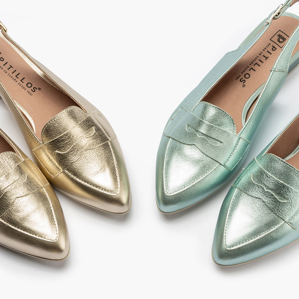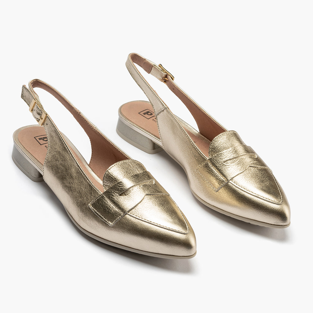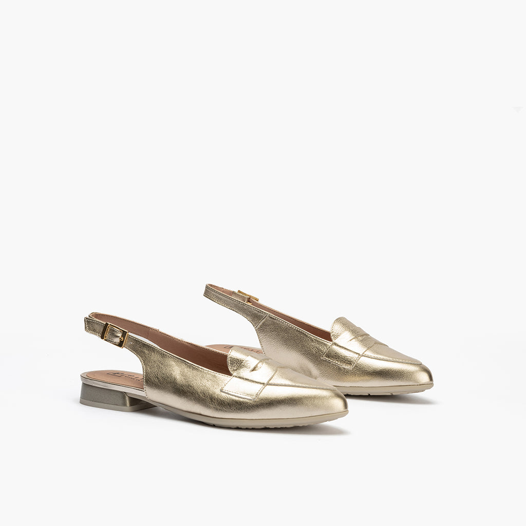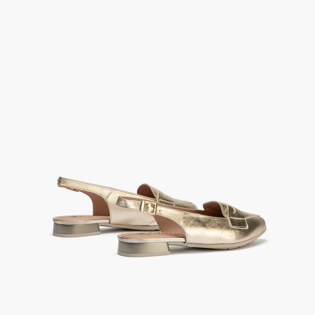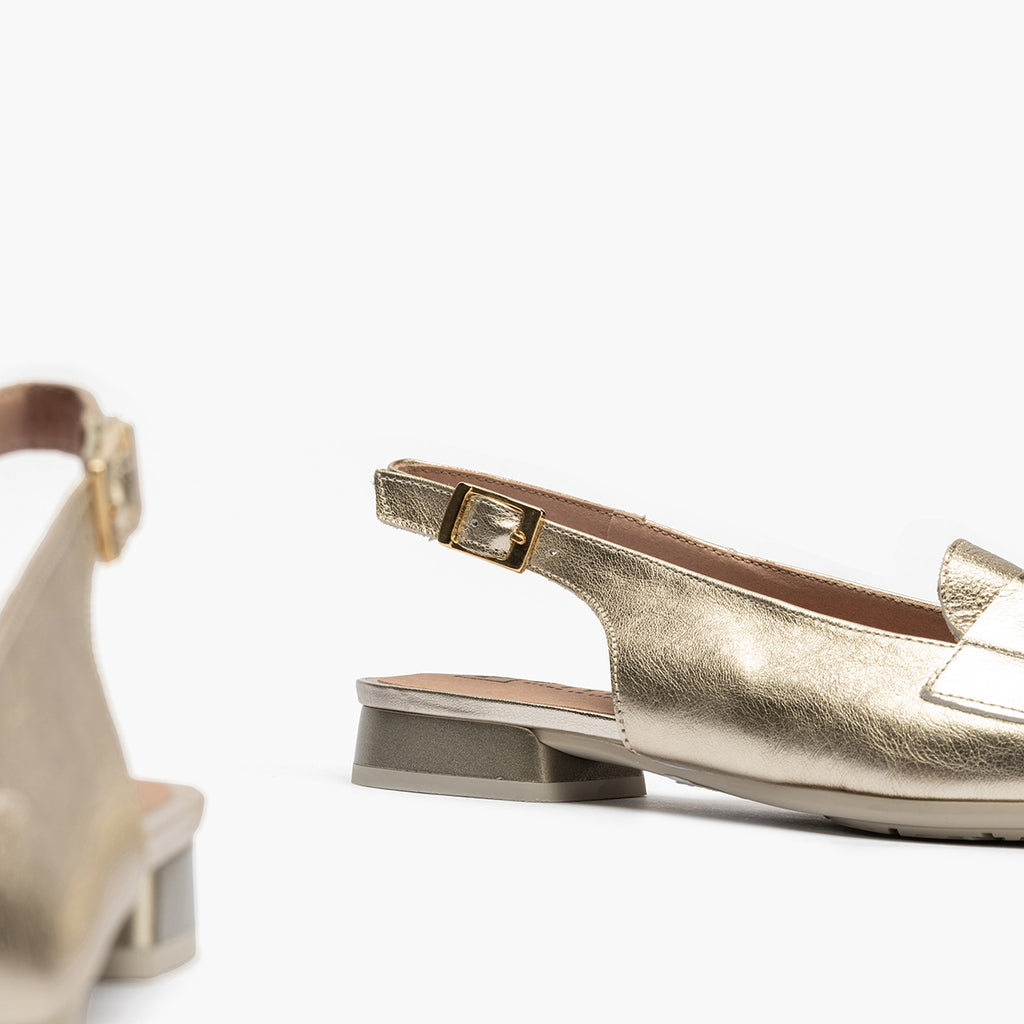 Mocasin talon abierto mujer con hebilla en piel laminado ORO