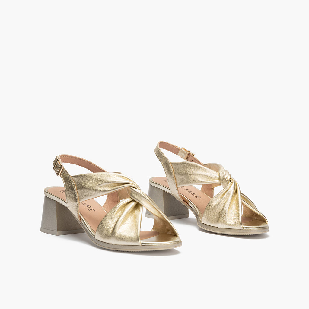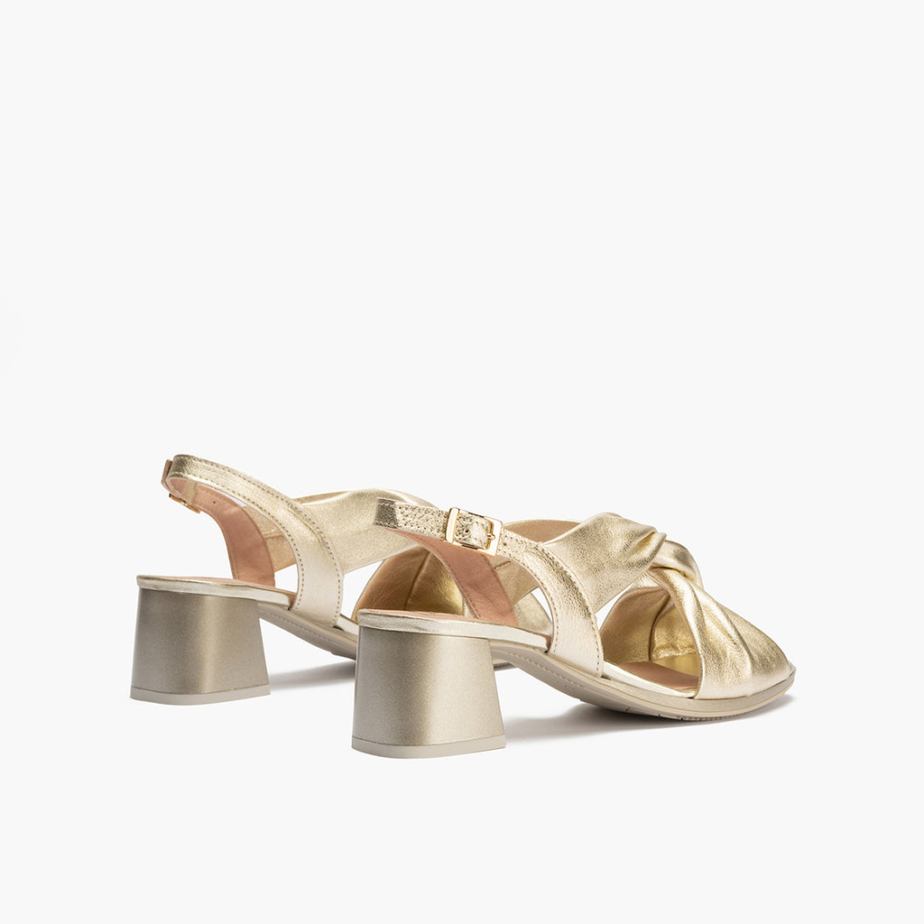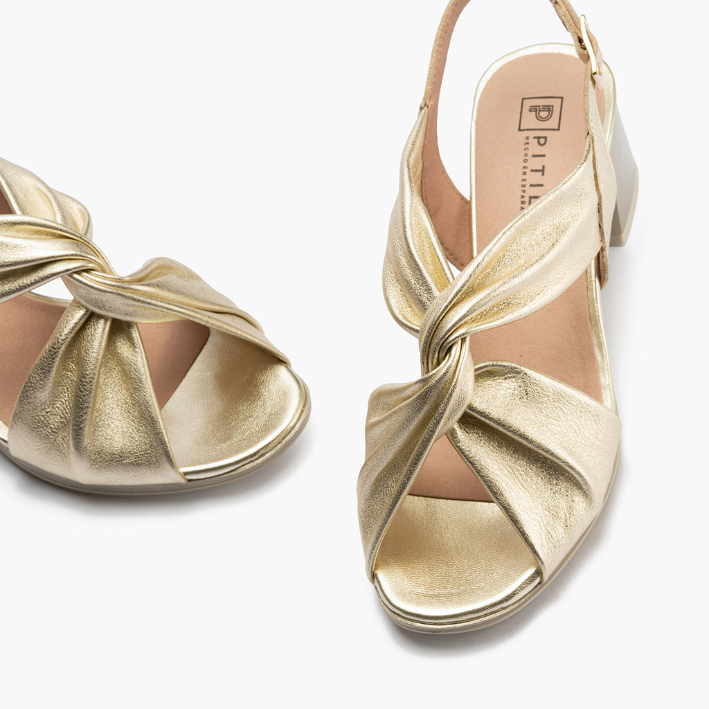 Sandalia con tubulares cruzados mujer con hebilla en piel laminado ORO