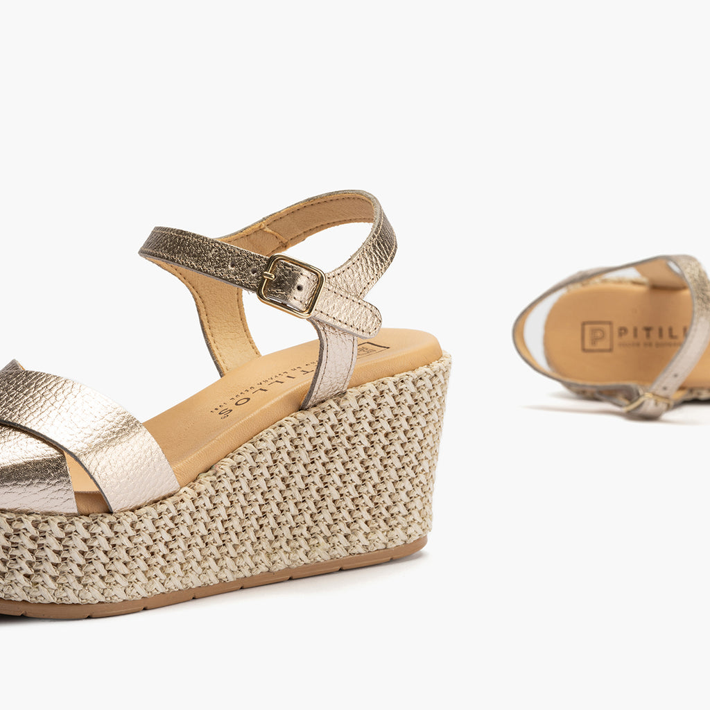 Confeccionada en Piel Laminada para un toque elegante y diferente. Altura de cuña: 7 cm. Incluye plantilla técnica textil para extra-confort y sensación térmica óptima esta primavera/verano. compuesta por fibras transpirables para máximo confort.