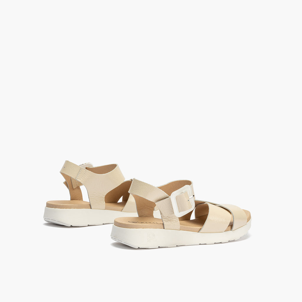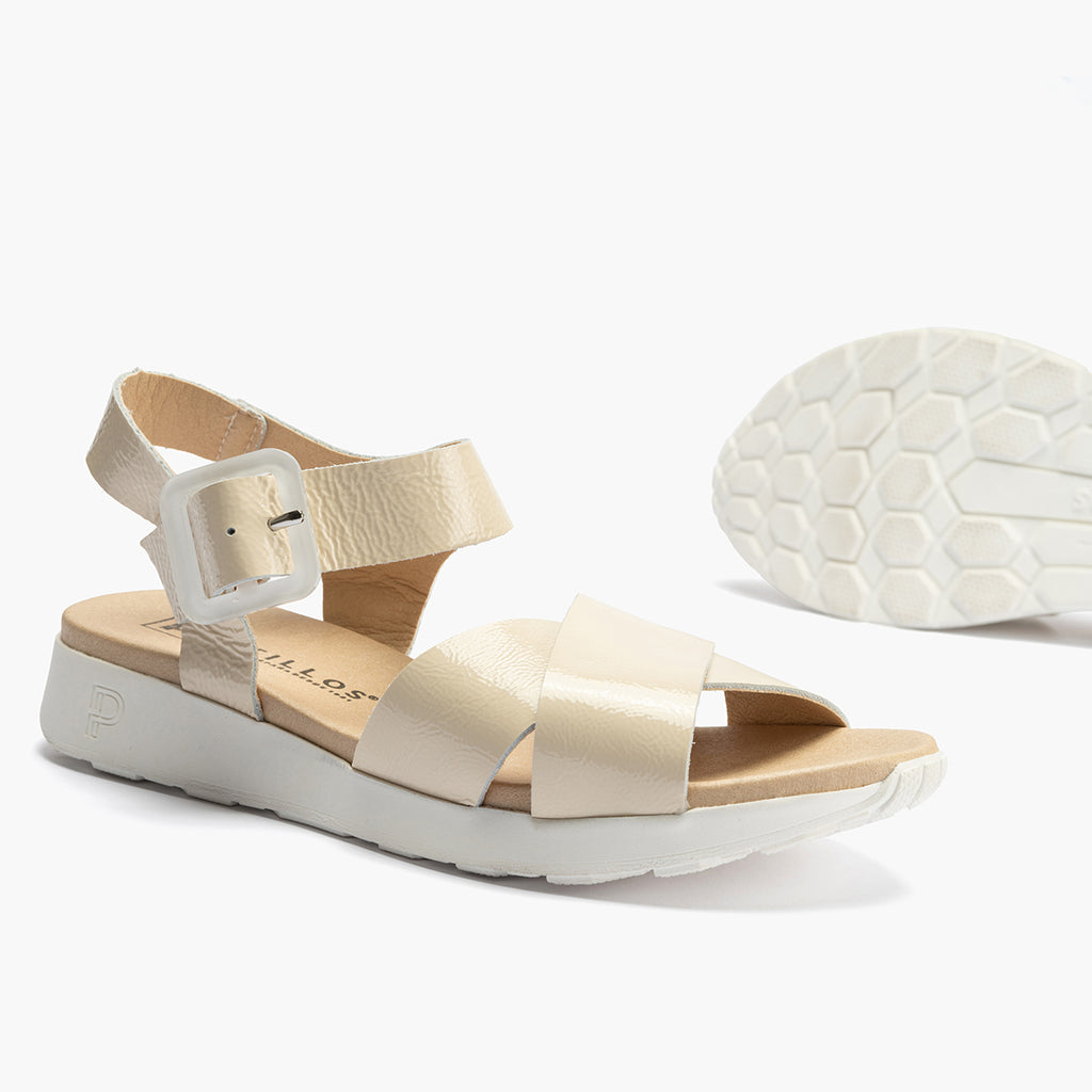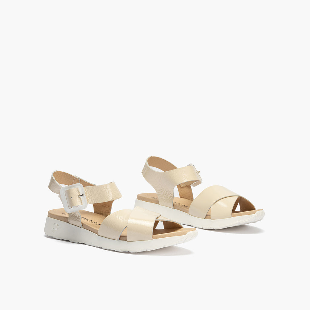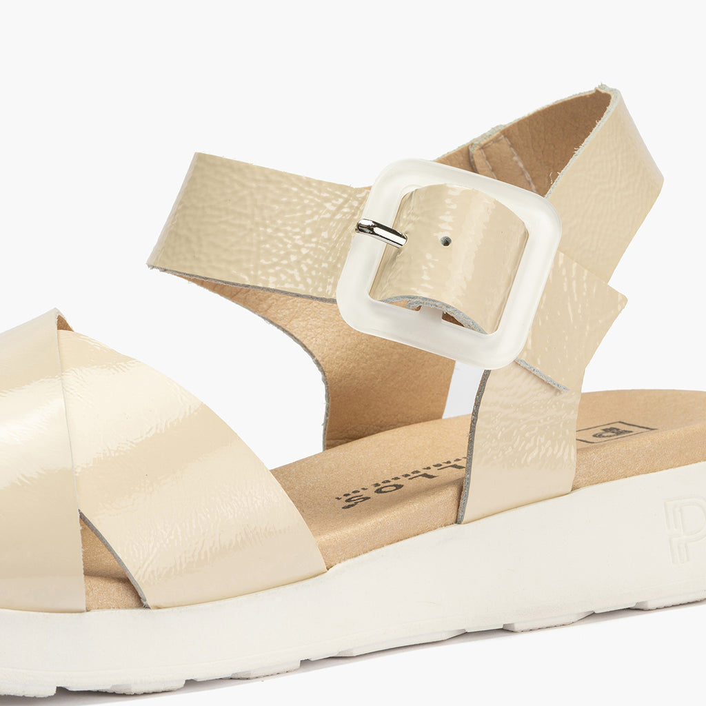Sandalia pala cruzada mujer con hebilla en piel charol CREMA