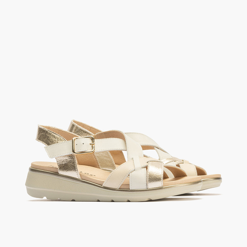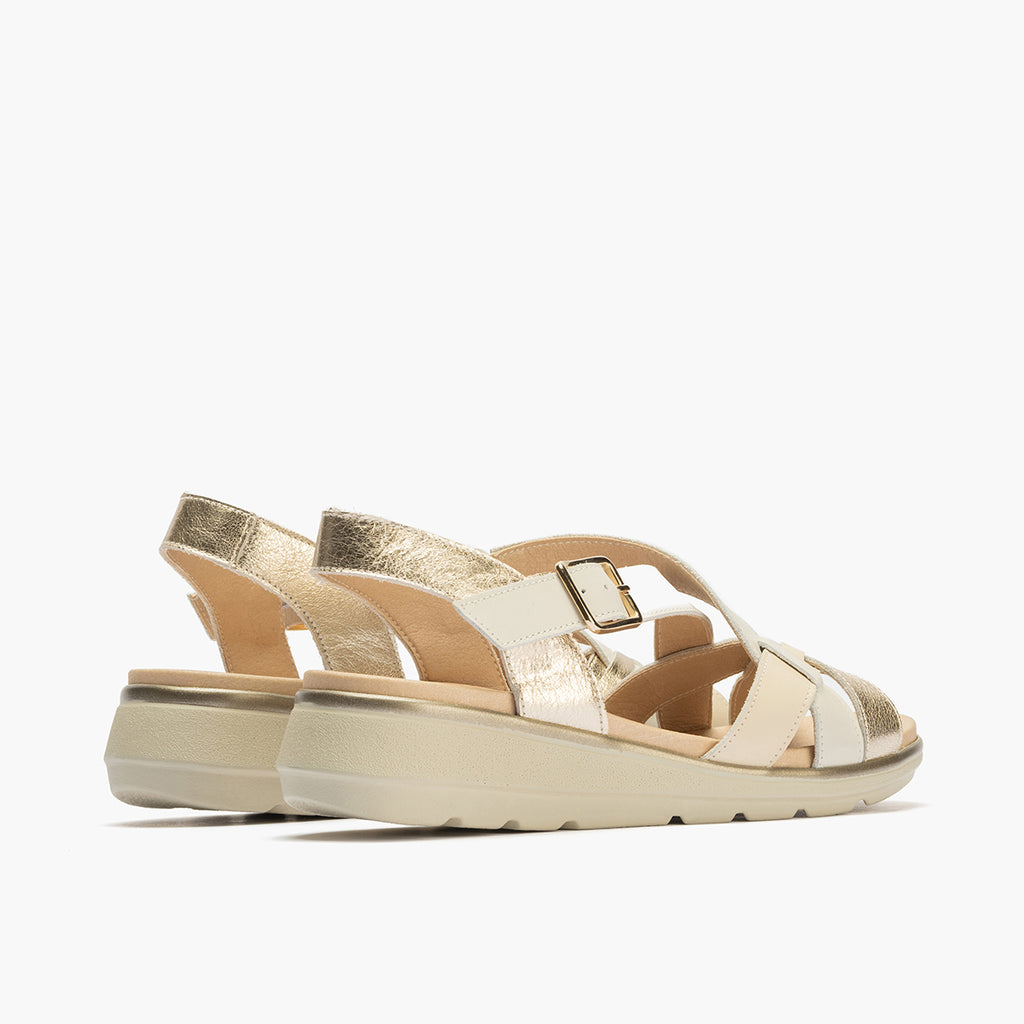 Sandalia tiras cruzadas mujer con hebilla en laminado con napa ORO