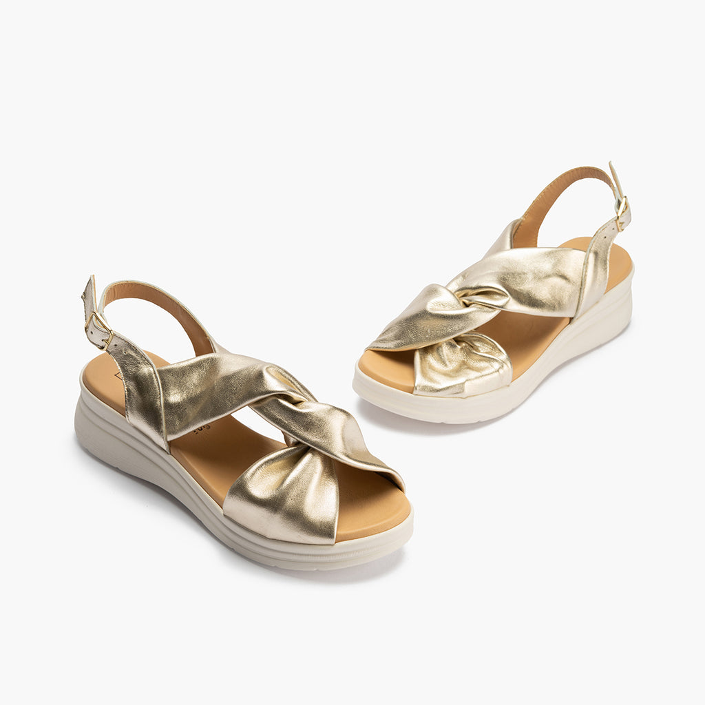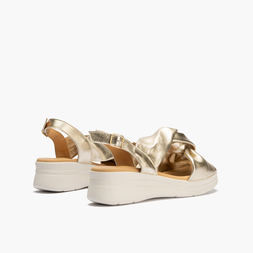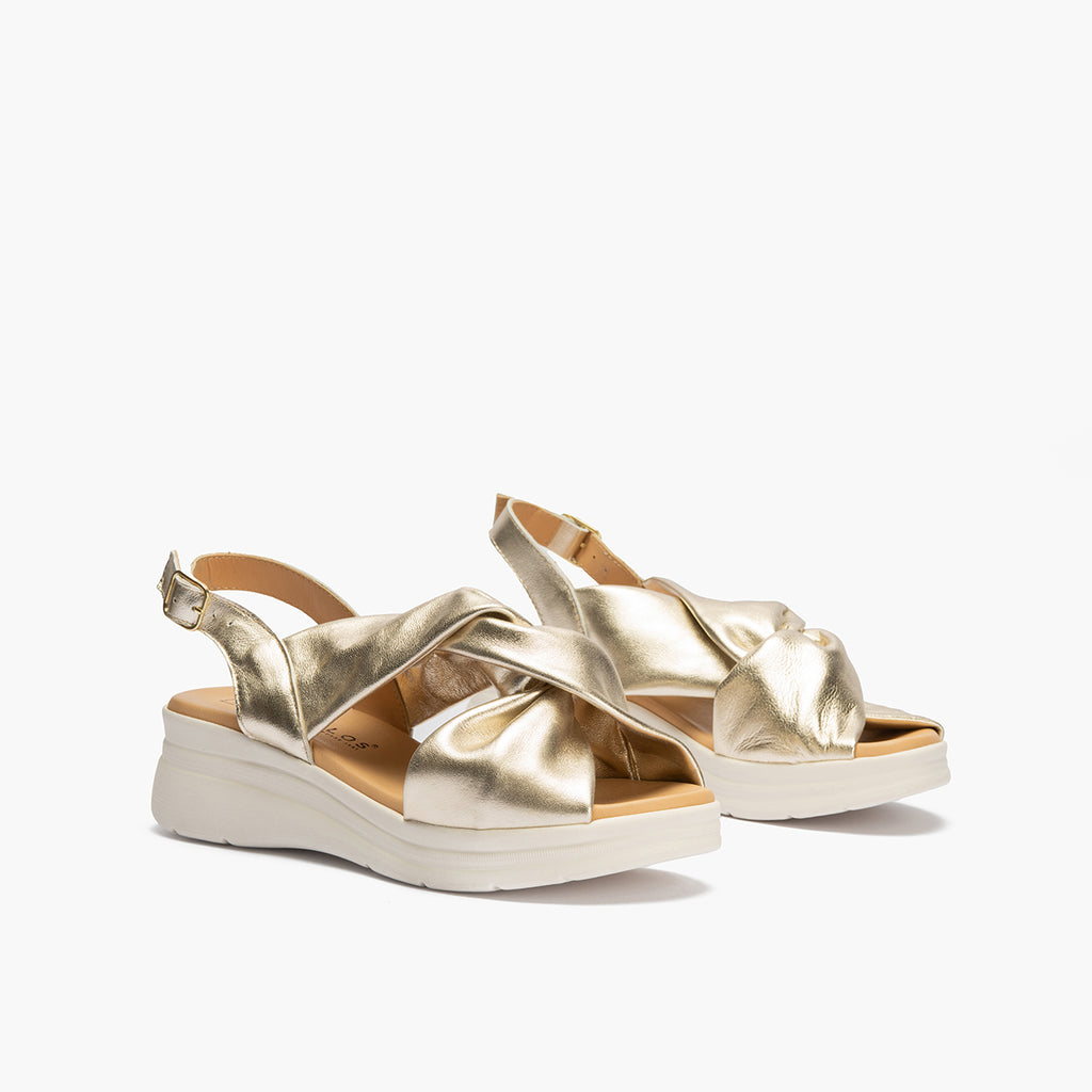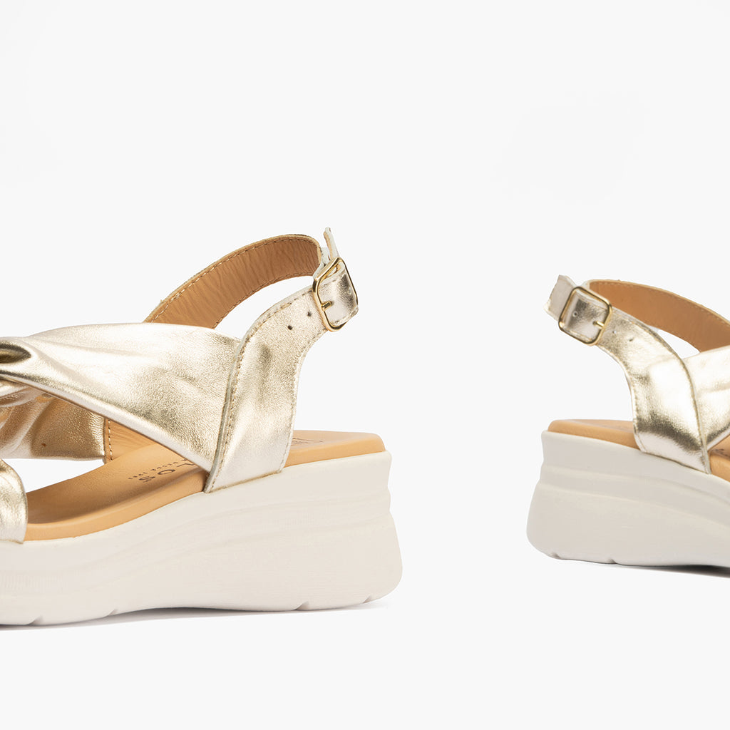 Sandalia tubulares cruzados mujer con hebilla en piel laminado ORO